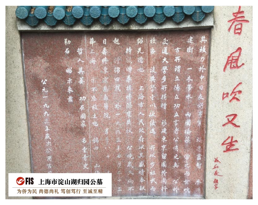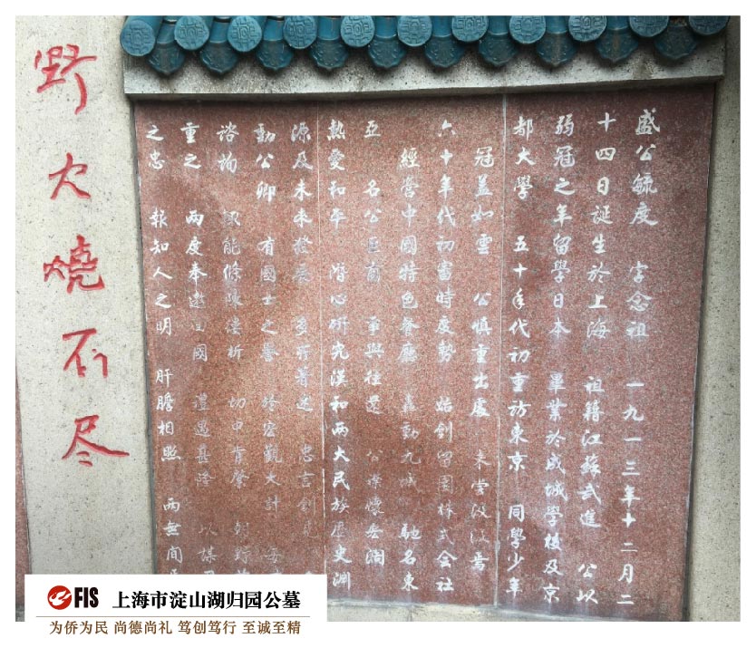 1993年,盛毓度先生因病在东京逝世。遵照其叶落归根的遗愿,归葬上海市淀山湖归园公墓。他的墓后立有碑石,墓碑两侧为墓志铭,墓地左右两根石柱上,镌刻着盛毓度先生的遗墨:“野火烧不尽,春风吹又生”,体现了他一生坚韧不拔的奋斗精神。