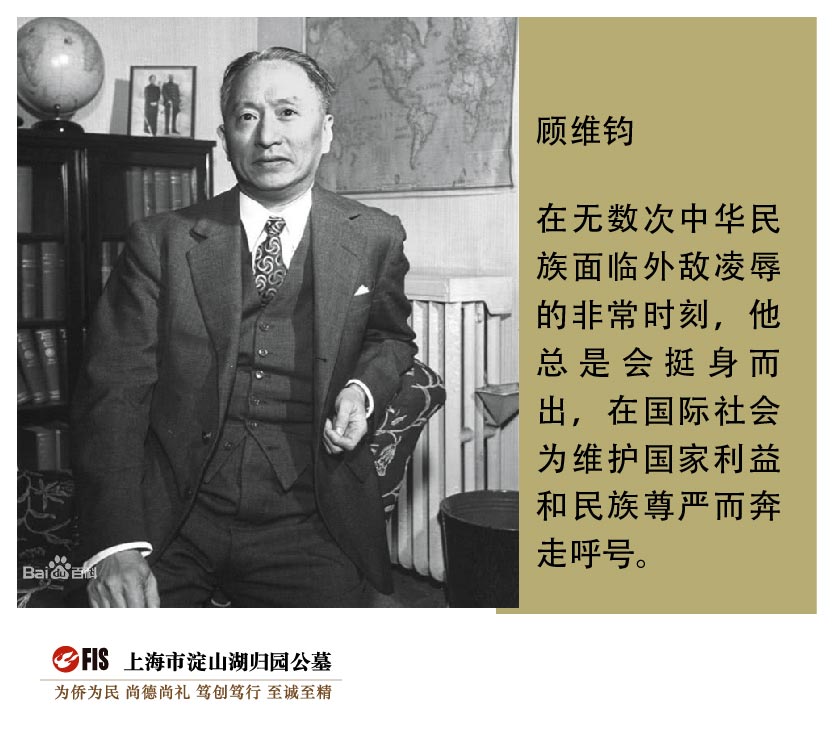 1919年,顾维钧作为中国政府代表出席巴黎和会,力争山东主权,拒签对德和约。1957年,他当选为国际法院法官。晚年定居美国纽约,1985年病逝,享年98岁。