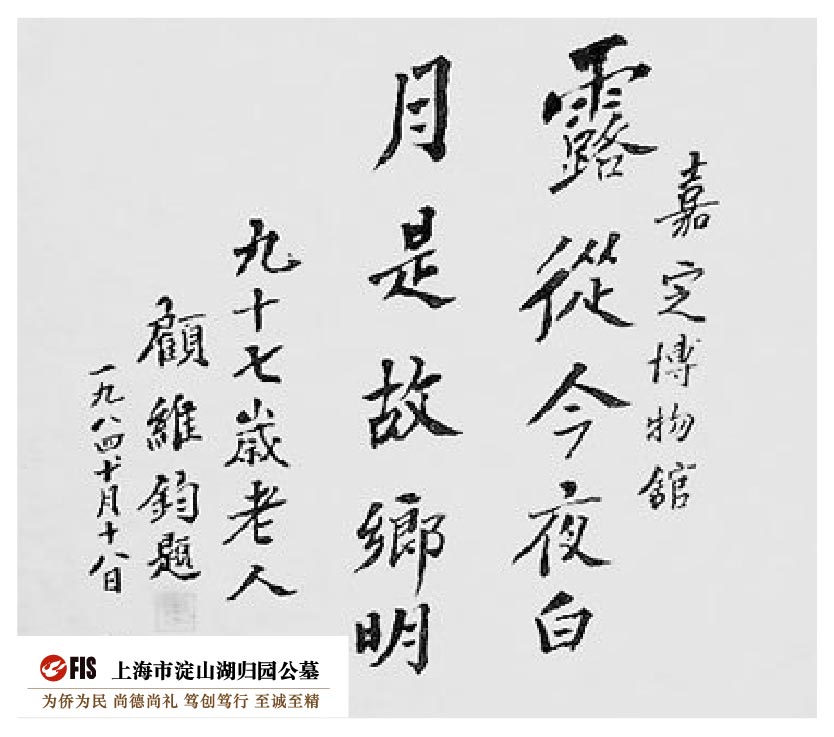 月是故乡明,顾维钧晚年定居美国纽约,分外思念故国家乡他每天的晚餐必吃中餐,特别想吃家乡上海嘉定的塌棵菜和罗汉菜。只要有上海来客,他都要问去过嘉定否。1983年,他的女儿顾菊珍回国观光,顾维钧再三嘱咐女儿一定要到家乡看看,并将他珍藏多年的明代“嘉定四先生”和民族义士侯峒曾、黄淳耀的墨迹带回,献给国家。