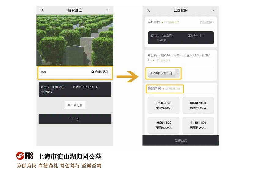 第三步:输入故人姓名搜索墓位——选择祭扫或落葬日期——按要求填写预约信息(均为必填项)——完成预约;