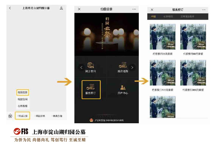第二步:在公众号菜单栏点击“归园云祭”——“服务预订”——有5种套餐可供选择;