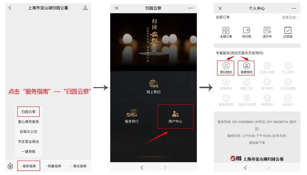 自4月13日起,“上海市淀山湖归园公墓“微信公众号(sh-dshgy)持续开通预约祭扫、落葬功能。市民群众可通过公众号预约祭扫、落葬服务,每位祭扫预约成功者最多可携4位亲属同行;每位落葬预约成功者最多可携9位亲属同行。预约名额每日限量提供,先订先得,约满为止。第一步:关注归园微信公众号;第二步:点击服务号内“服务指南”--“归园云祭”--“用户中心”选择相应的预约界面,选择来园日期及时间段,并填写预约人员及随行人员信息(姓名、手机号码、身份证号码)为必填项;第三步:预约成功后,将会收到预约成功凭证及短信通知,来园当天可凭预约成功凭证及短信入园。(电子凭证在网上预约祭扫界面中,可点击打开后查看“我的祭扫预约列表”)