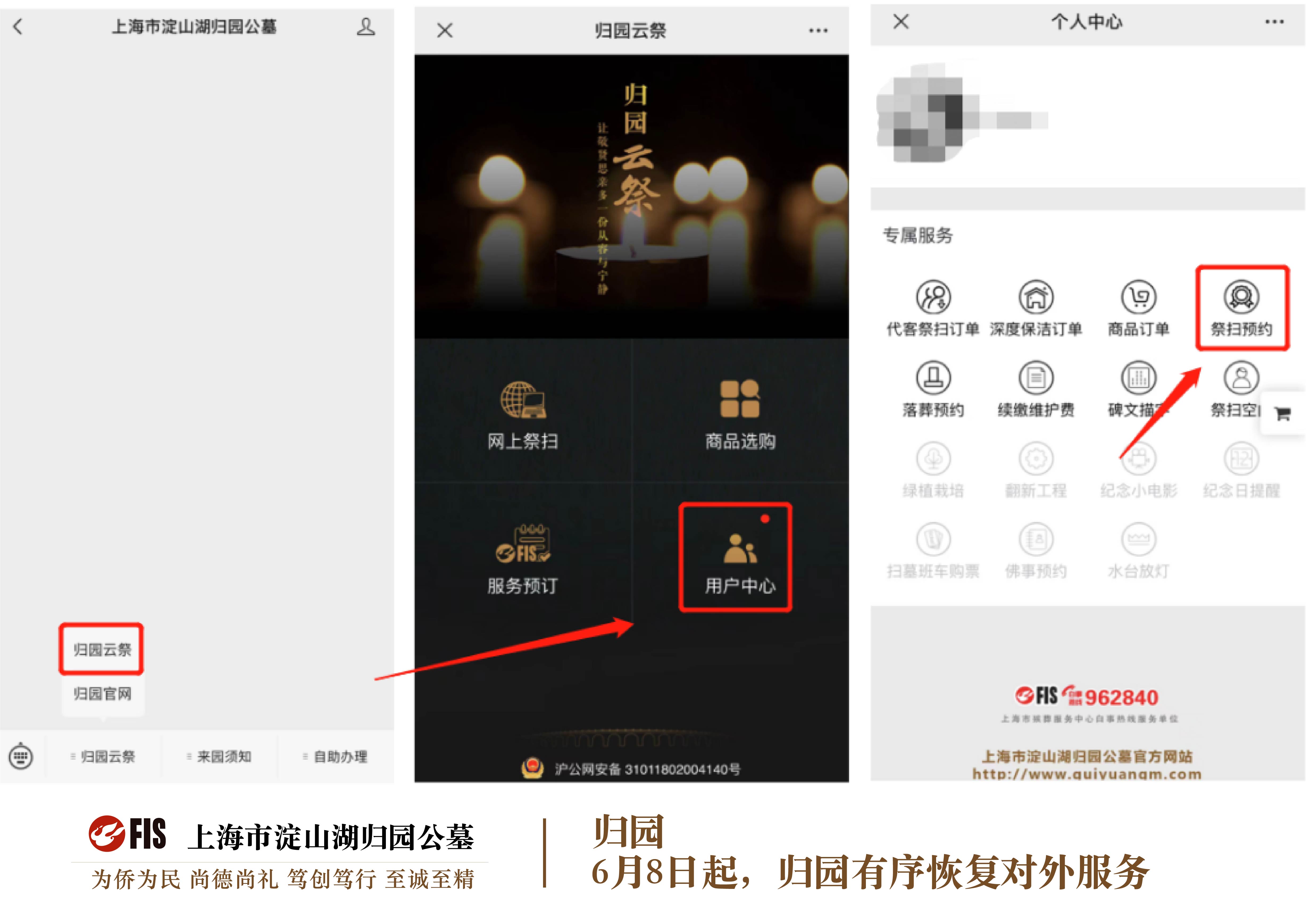 6月8日起,恢复预约祭扫服务,每天5个时段(08:30-16:00,每时段1.5小时),需提前3天预约。每位预约成功者,最多可携4位亲属同行。