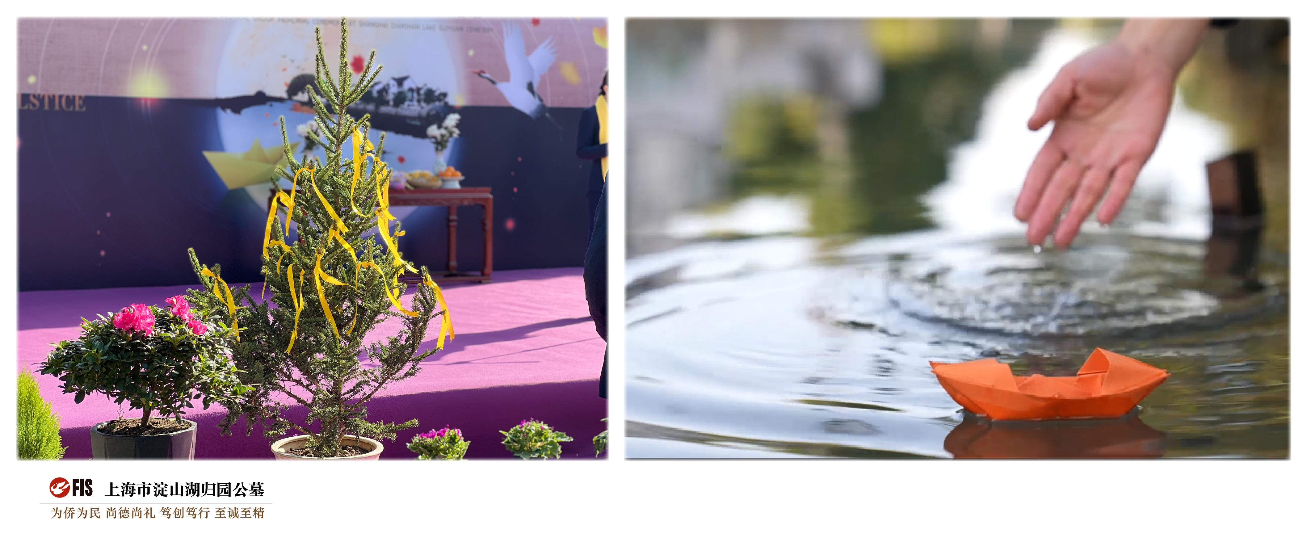 归园员工还自己手折乌蓬船,放泊在碧水之间;寄托思念的黄丝带,悬挂于松柏之上。奉献鲜花、奉三献礼等传统的祭祀礼仪环节,寓意漂泊的天涯游子们一分乡情思念,一袭乡味愁绪,将温暖的敬祈之情寄寓于礼仪细节,将人伦思念和对逝者的记忆融入其中。