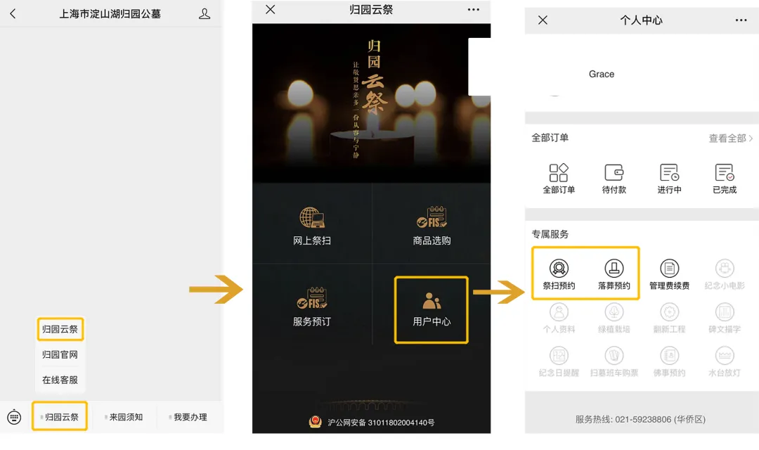微信公众号:关注“上海市淀山湖归园公墓”微信公众号(sh-dshgy)——“归园云祭”——“用户中心”——“祭扫预约”——“立即预约”——输入故人姓名进行搜索并确认——选择祭扫日期及时段(至少提前3天预约)——输入预约人信息、随行人员信息(选填,如无随行人员可不填)——输入来园祭扫原因——勾选必填项(个人承诺及相关告示)——点击“立即预约”——收到预约成功短信(预约受理审核时间为48小时以内,请耐心等待)